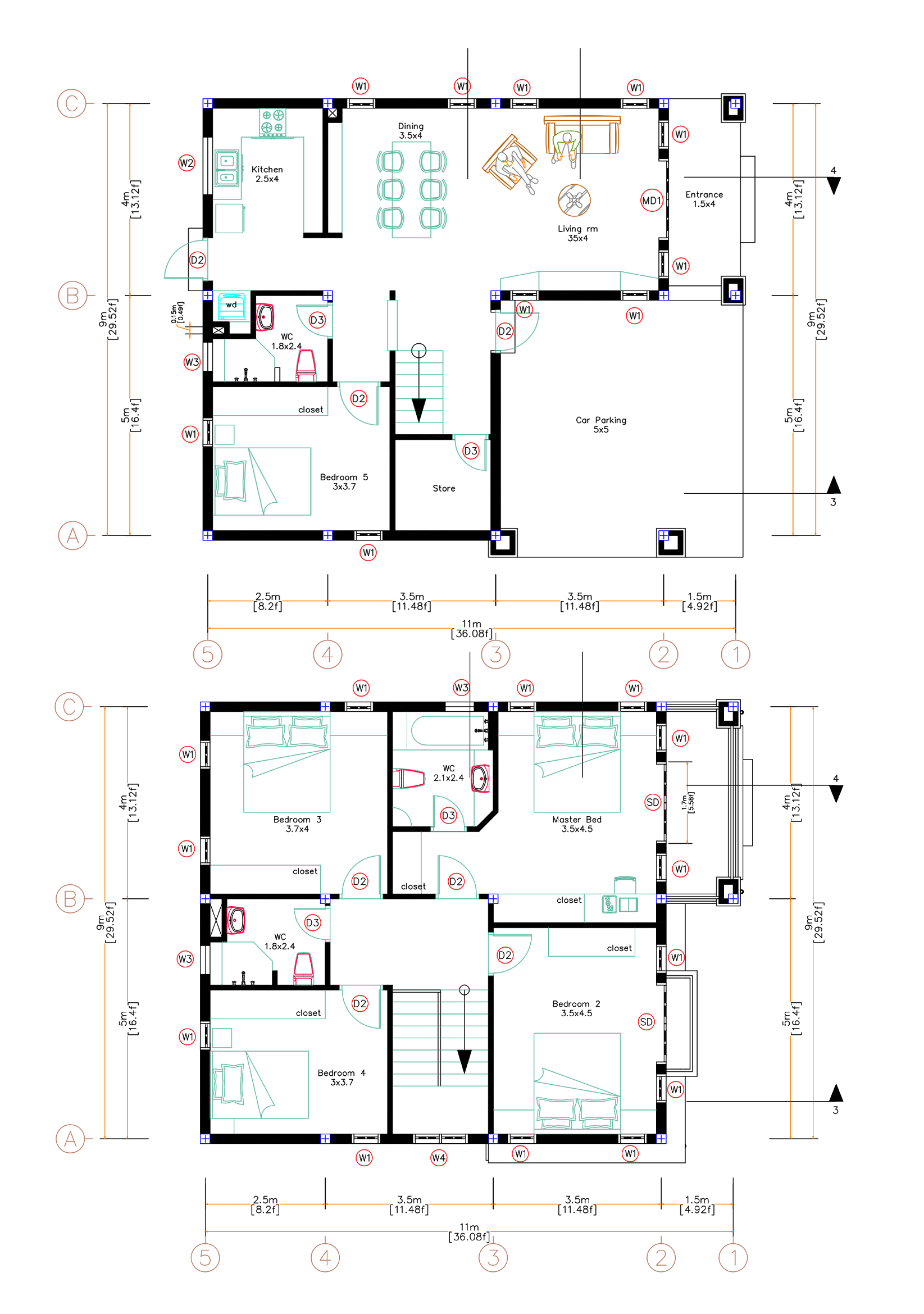30×36 House Design Plan 5 Beds 3 Baths 9×11 Meter PDF Full Plans. This villa is modeling with 2 stories level. It’s has 5 bedrooms. Est. Price around 50-60k usd construction only, furniture not include.