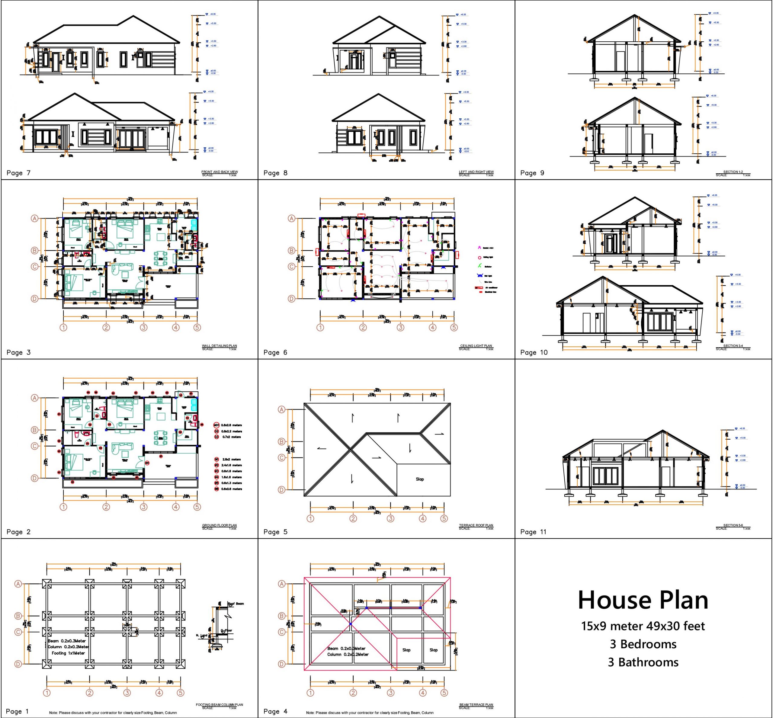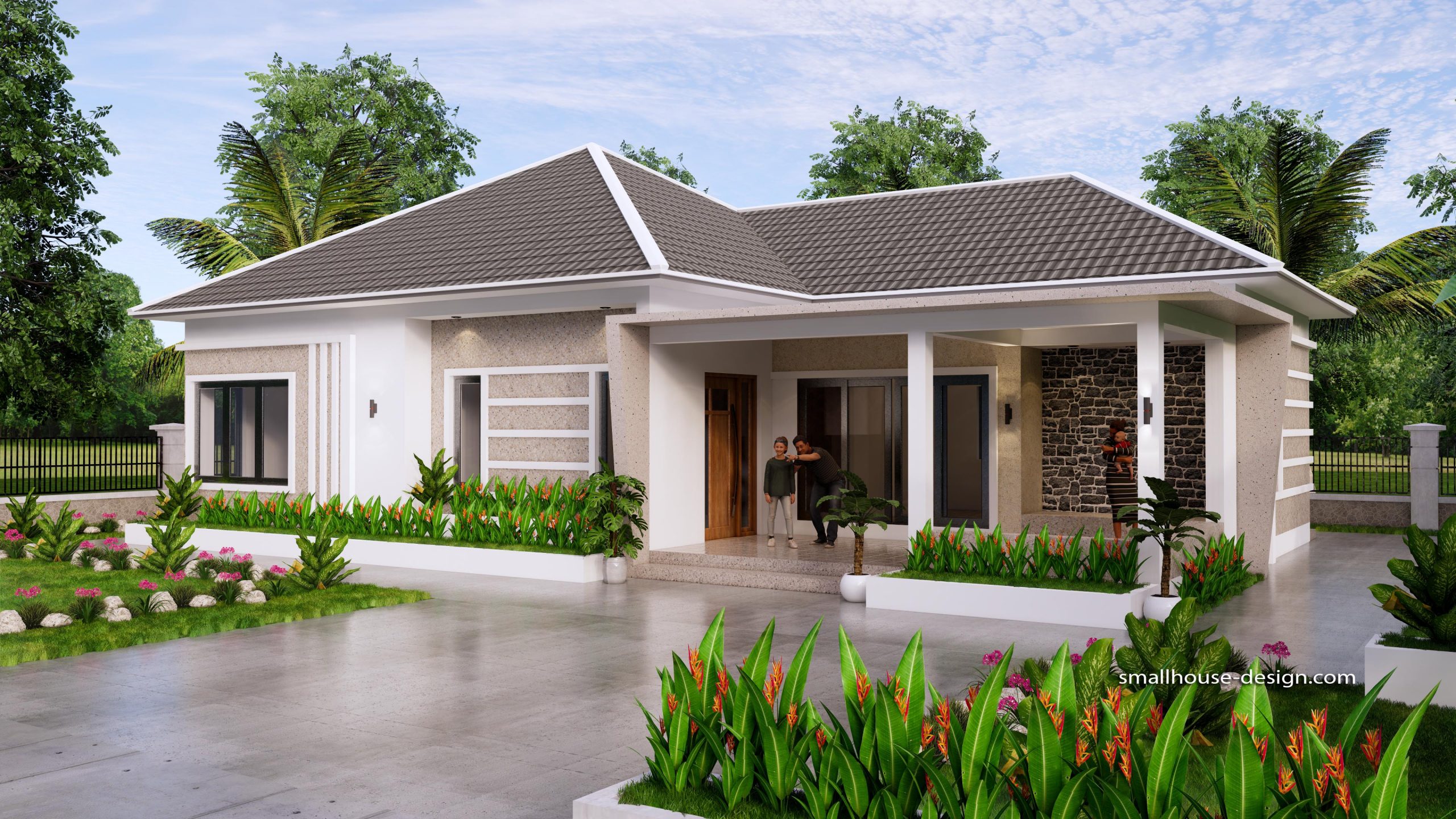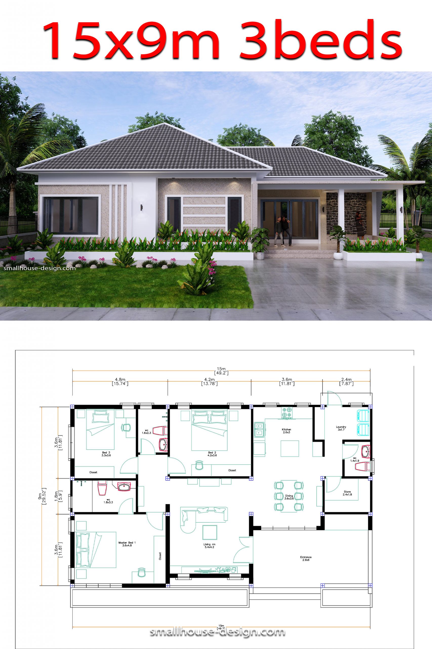49×30 Small House Plan 15×9 Meter 3 Beds 3 Baths Hip Roof. This villa is modeling by SAM-ARCHITECT With 1 stories level. It’s has 3 bedrooms. Est. Price around 30-40k usd construction only, furniture not include.