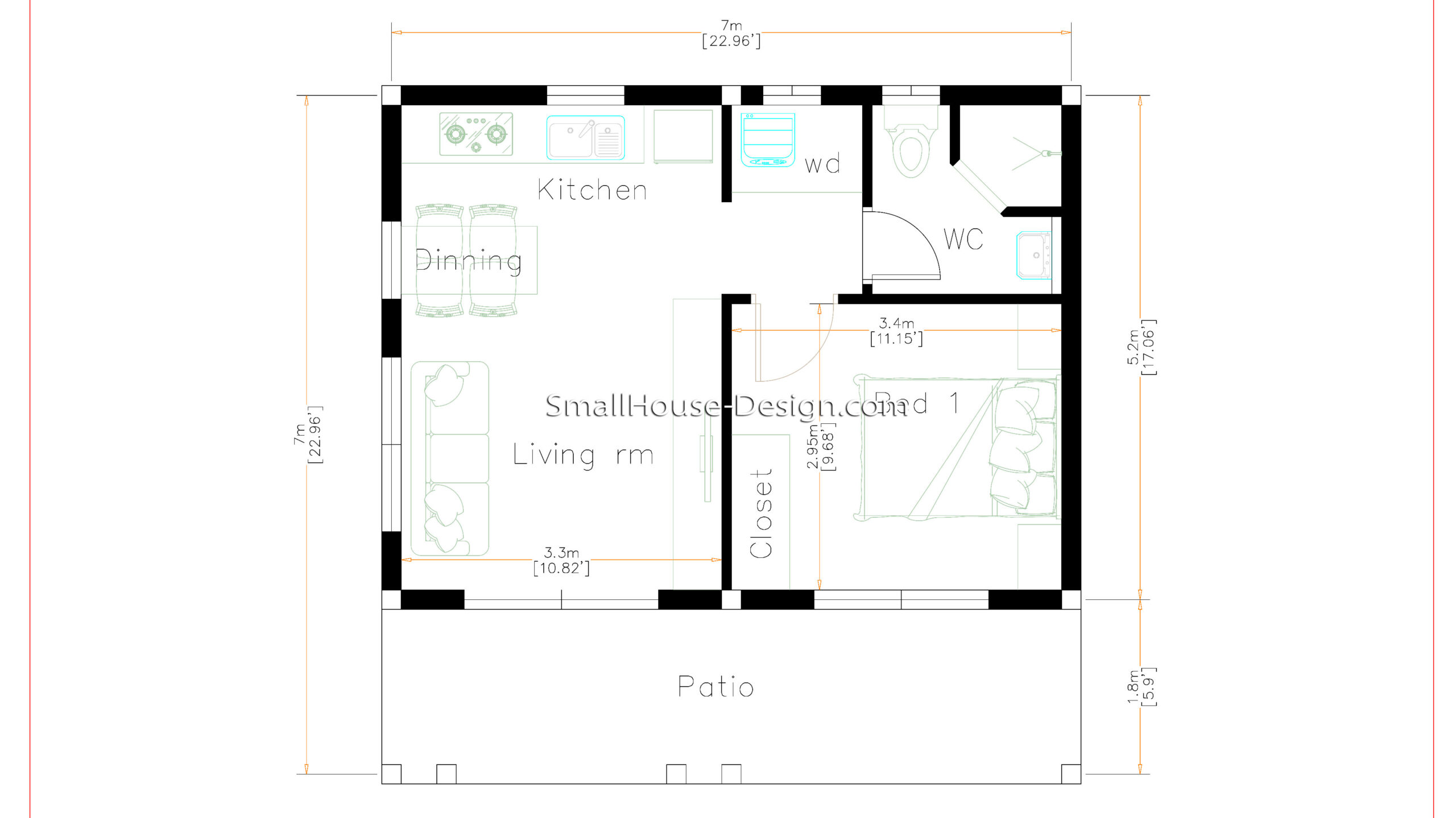 Small Plans 7×7 Meter 23×23 Feet One Bed