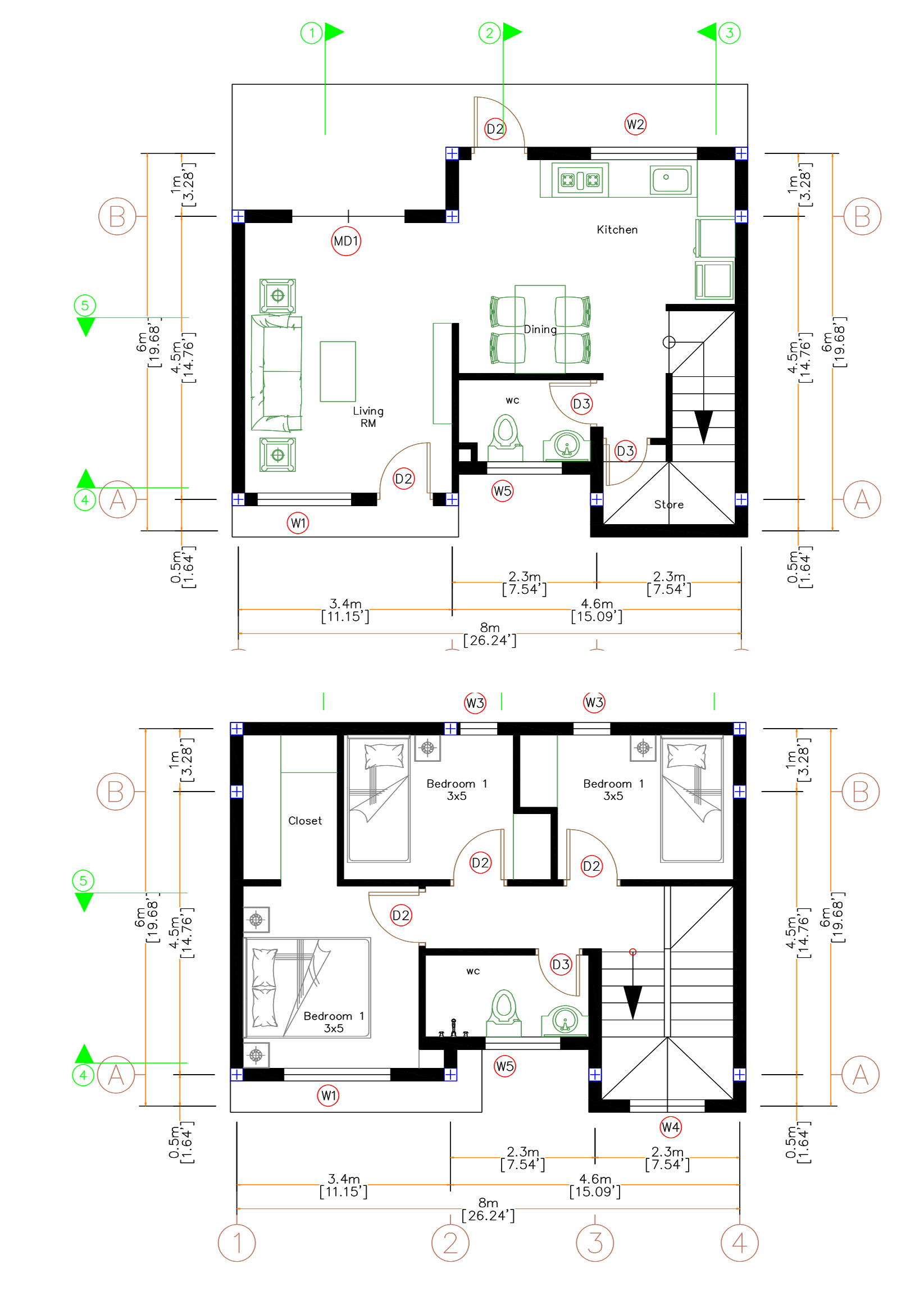 House Plan Drawing 6×10 Meters 20×33 Feet 2 Beds