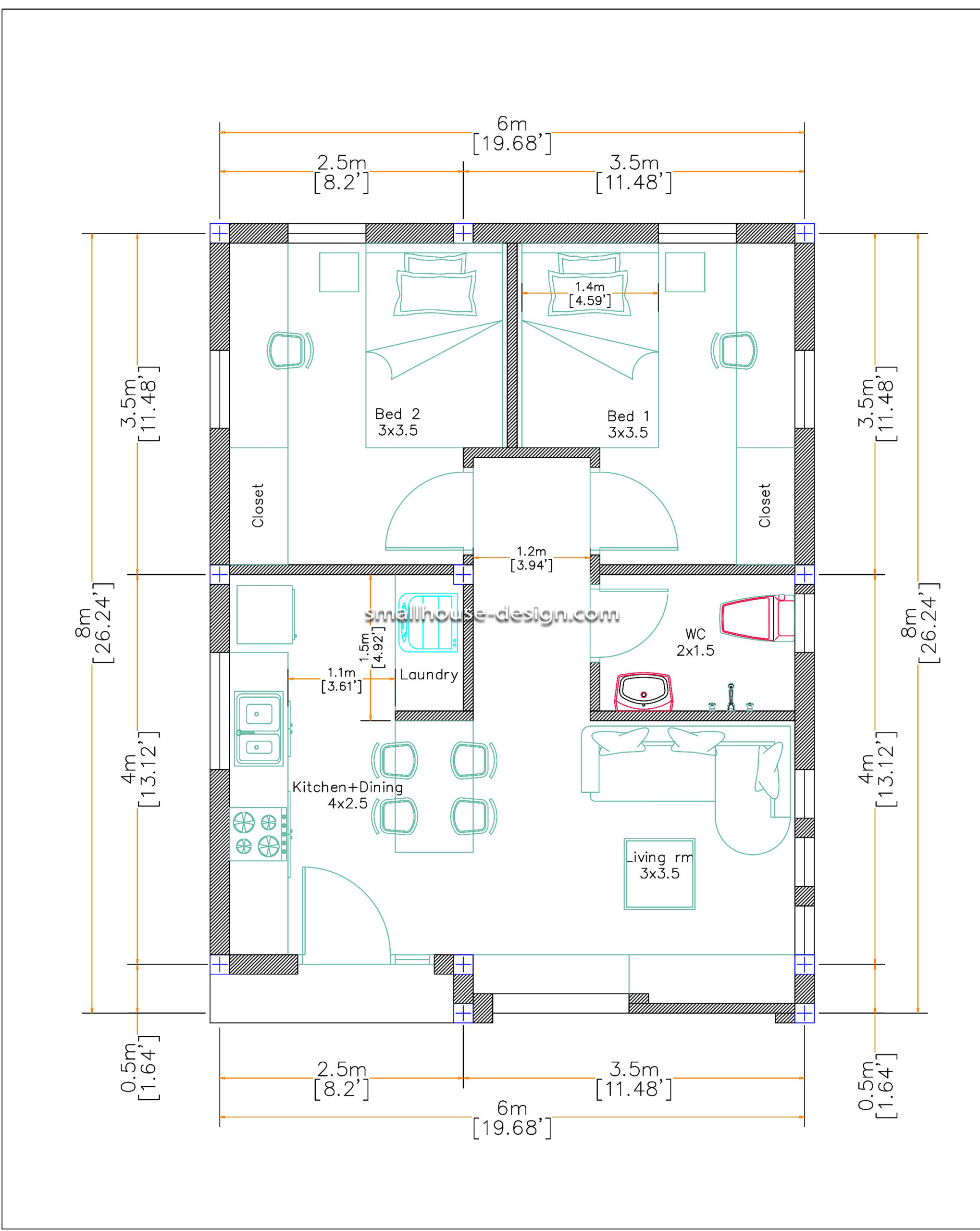 House Plan Drawing 6×10 Meters 20×33 Feet 2 Beds
