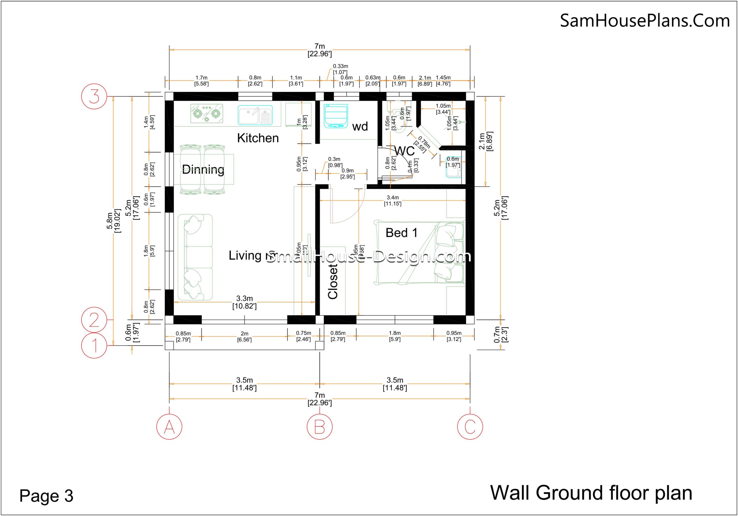 Small Plans 7×7 Meter 23×23 Feet One Bed